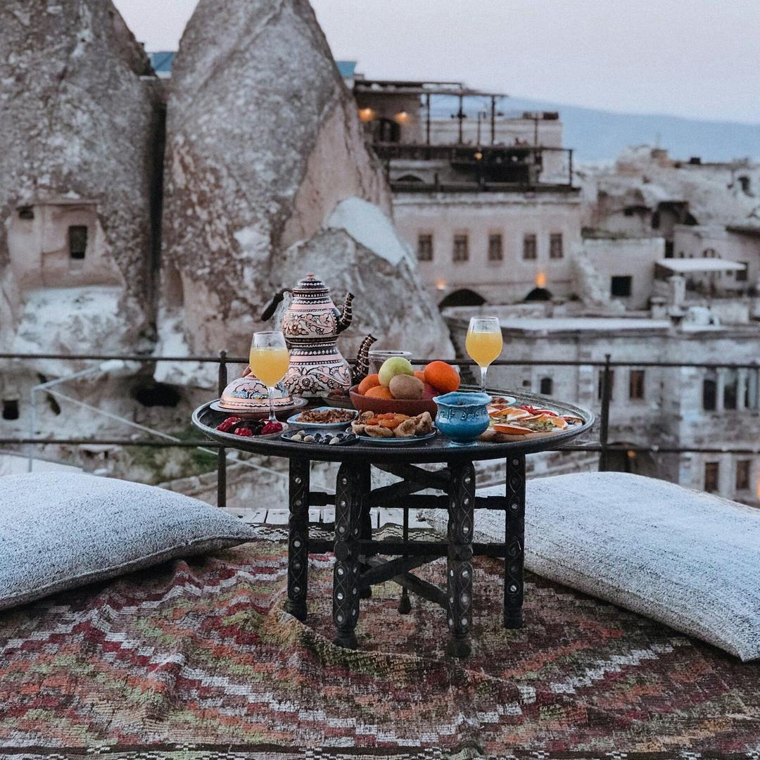 Cappadocia is most famous for its distinctive Narince white wine, which offers a crisp, fruity taste with notes of citrus and green apple. The Kalecik Karası red wine is another standout, known for its rich, velvety texture and flavours of red berries and spices, complemented by a subtle earthy undertone. The region’s volcanic soil and unique climate contribute to the wines’ distinctive characteristics, making them an exciting experience for wine lovers, especially during tastings at local wineries that offer a blend of tradition and innovation. The local cuisine is a reflection of its cultural heritage, featuring hearty, flavourful dishes that satisfy every palate. A speciality of the region is testi kebab, a slow-cooked meat and vegetable stew prepared in a clay pot that is broken open at your table. Other must-try dishes include manti (Turkish dumplings) and various mezes (small appetisers). Many restaurants offer outdoor seating with spectacular views of the valleys and fairy chimneys, creating a dining experience like no other.